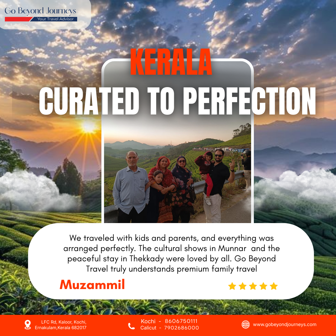 We traveled with kids and parents, and everything was arranged perfectly. The cultural shows in Munnar and the peaceful stay in Thekkady were loved by all. Go Beyond Travel truly understands premium family travel
