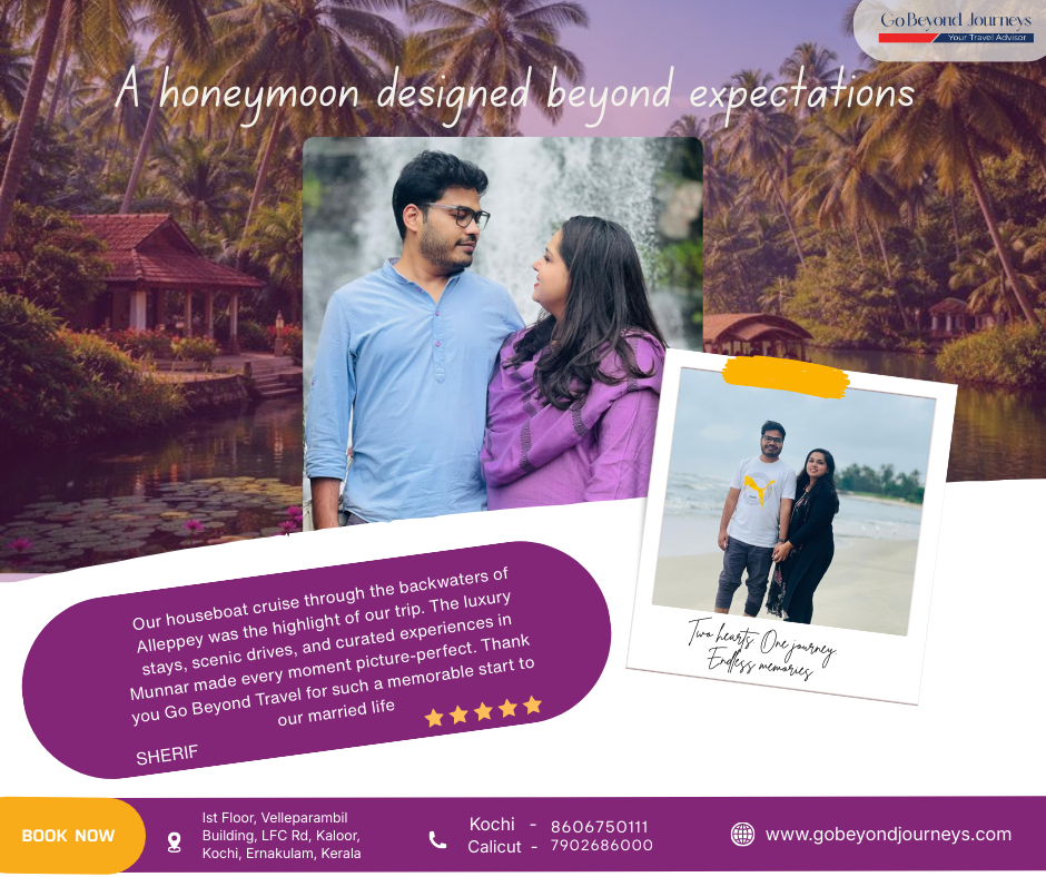 Our houseboat cruise through the backwaters of Alleppey was the highlight of our trip. The luxury stays, scenic drives, and curated experiences in Munnar made every moment picture-perfect. Thank you Go Beyond Travel for such a memorable start to our married life
